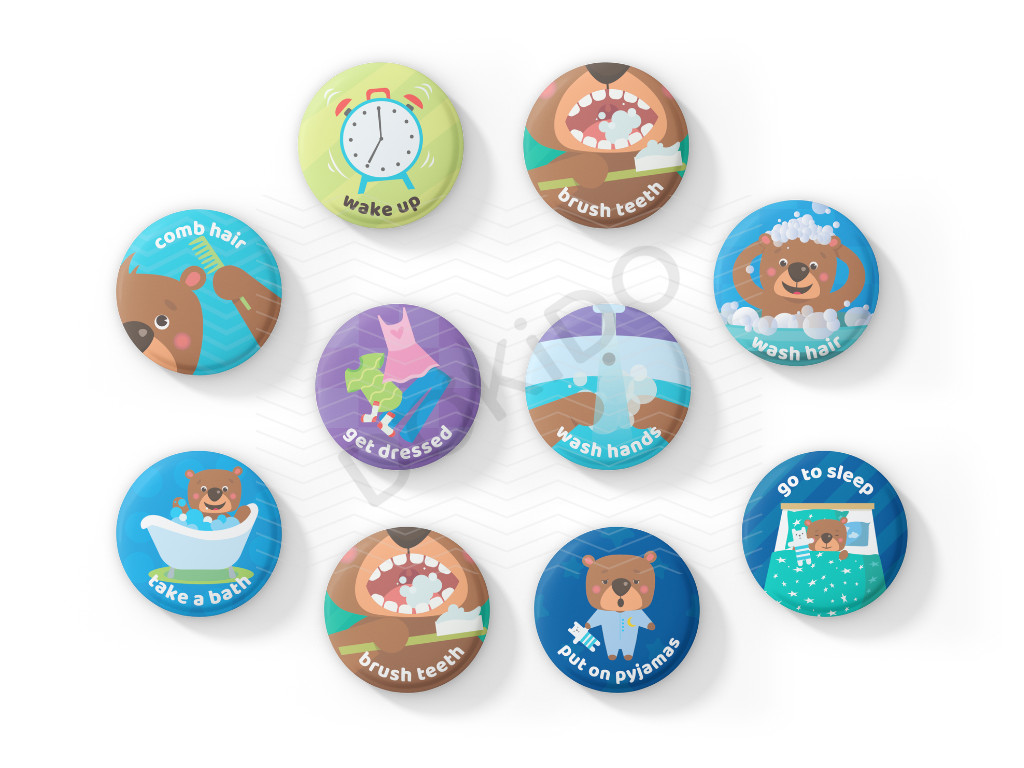 Tato sada butonků / magnetek, které pomohou dětem zafixovat si každodenní návyky a rituály, obsahuje: