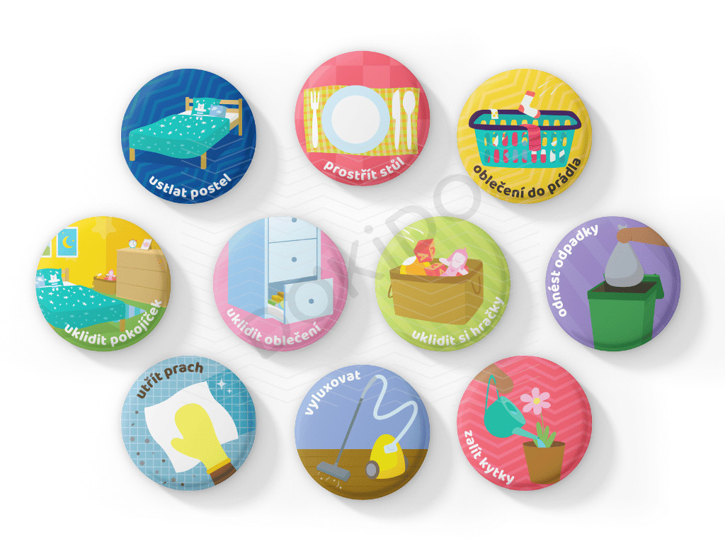 Tato sada magnetek, které pomohou dětem plnit své úkoly v domácnosti, obsahuje: