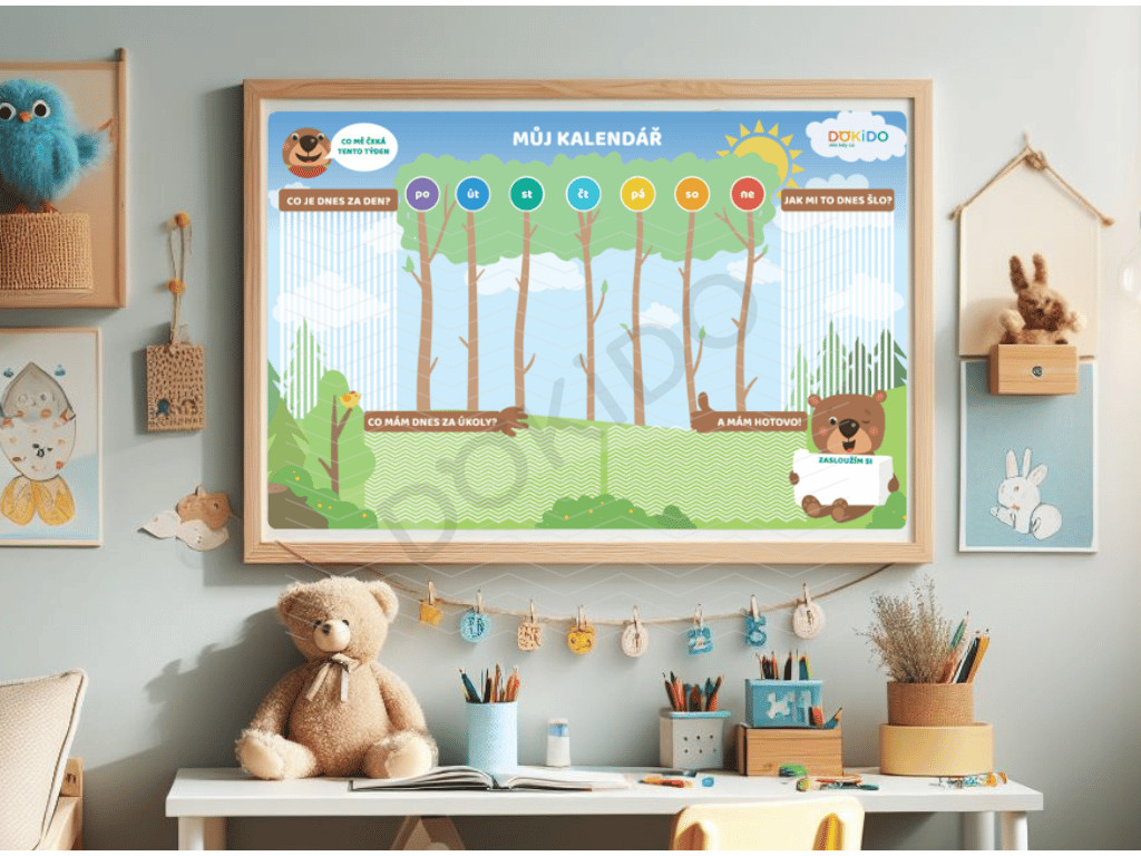 Je BAREVNÝ, ZÁBAVNÝ, téměř NEZNIČITELNÝ, PŘIZPŮSOBIVÝ VĚKU a nárokům každého dítěte, a DĚDIČNÝ (využije více generací). Děti se na něm naučí nejen co je za den, měsíc či roční období, ale také co je čeká v budoucím týdnu za aktivity a jaké mají denní povinnosti.