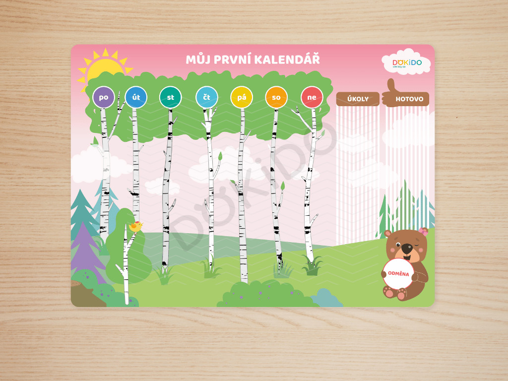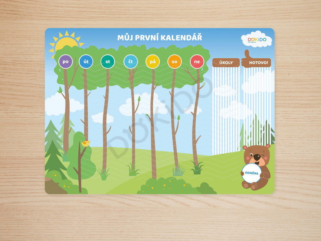Samostatná tabule MŮJ PRVNÍ KALENDÁŘ je podkladová plocha kalendáře pro děti, na kterou si umístíte vybrané magnetky (butonky) a můžete začít společně plánovat všechny aktivity a úkoly, které si jen usmyslíte. Díky správným magnetkám zodpoví kalendář dětem jejich všetečné otázky každý den v týdnu. Zde si můžete vybrat vhodné magnetky a sestavit si tak svůj kalendář na míru potřebám Vašeho dítěte.