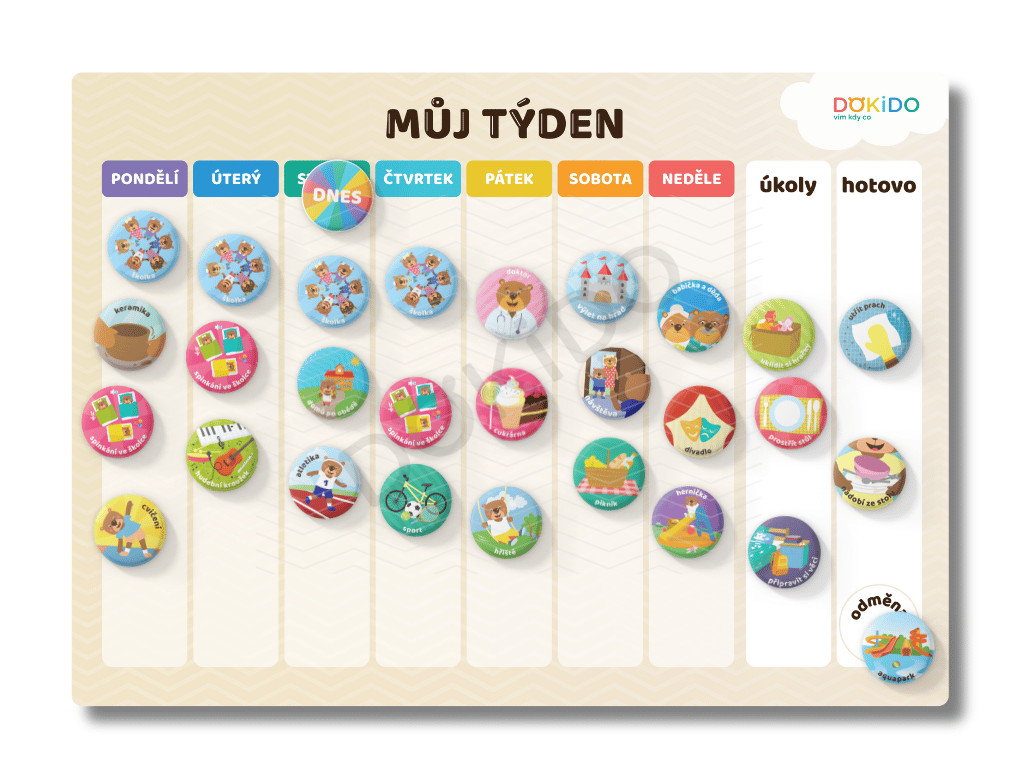 Kalendář obsahuje týdenní plán po jednotlivých dnech, na které dáváte magnetky plánovaných aktivit (např. školka, spinkání ve školce, domů po obědě, kroužek na daný den), případně kam půjdete po školce (nákup, hřiště, kamarádi, procházka, kolo…). Toto vše můžete nastavit v neděli večer na celý týden a pak posunovat pouze magnetku Dnes, kterou označíte aktuální den.