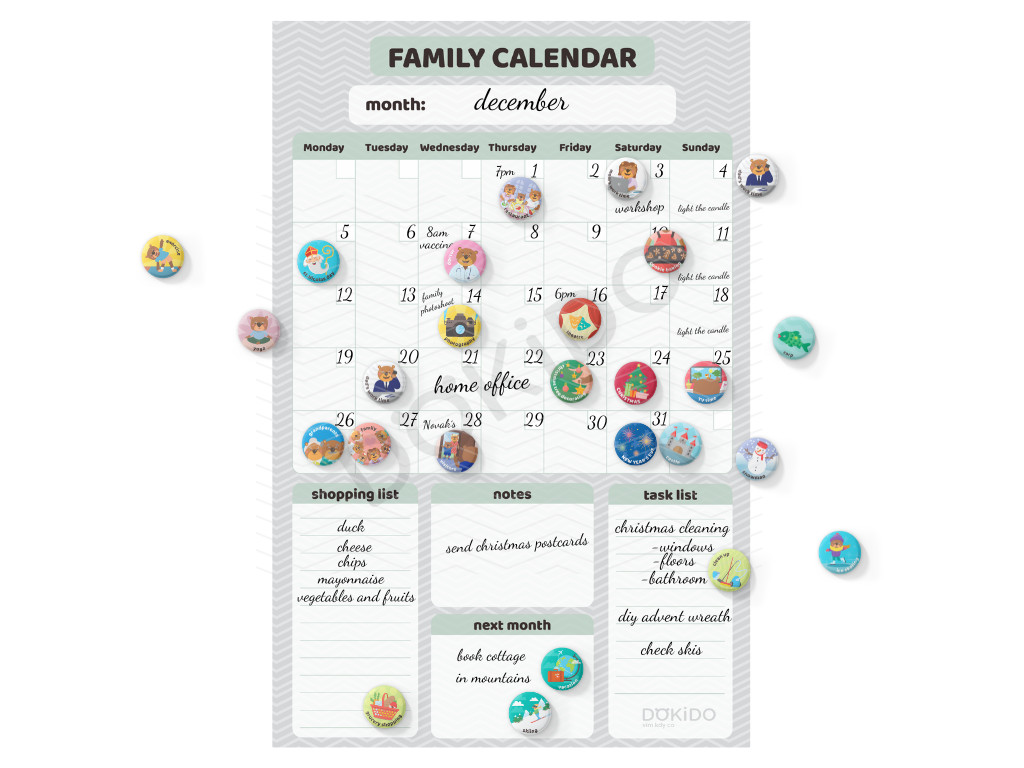 I rodinný kalendář může být hravý. Stačí přidat pár butonků z široké nabídky ZDE. Nebo vybrat rovnou sadu butonků SVÁTKY a pro RODIČE.