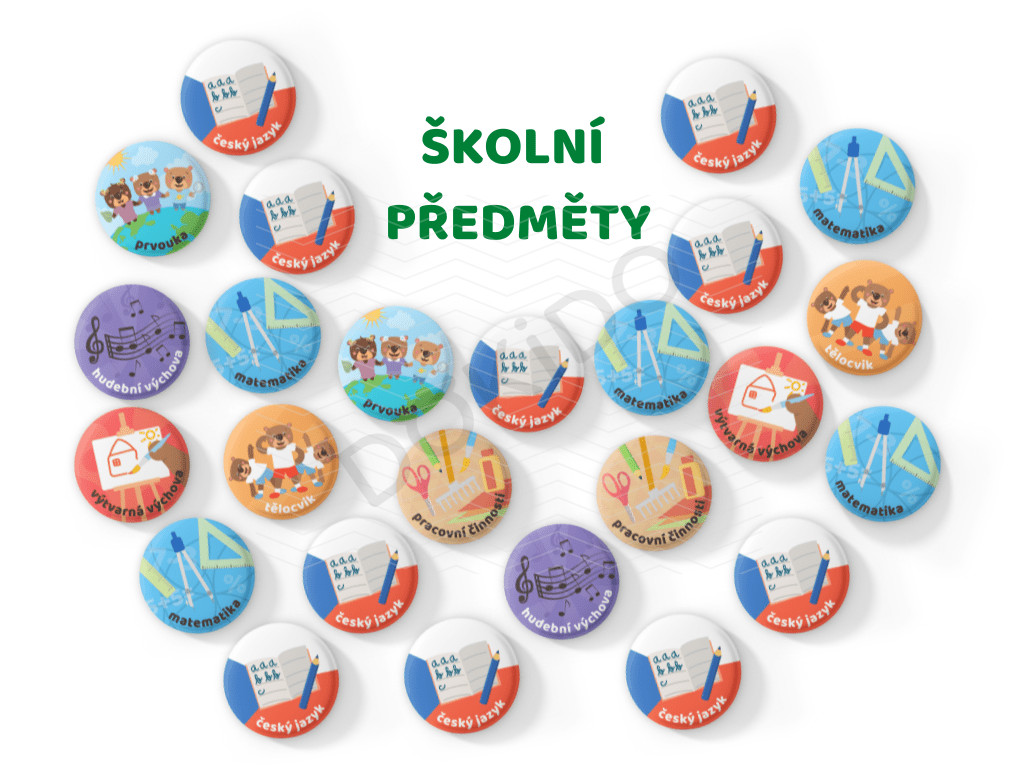 Magnetky (butonky) jsou ručně vyráběné technikou plackování ve velikosti 32mm a jsou opravdu téměř nezničitelné, voděodolné, omyvatelné a díky oblým hranám se s nimi snadno manipuluje. Všechny obrázky jsou velmi intuitivní a jejich význam pochopí i nečtenáři. Každý butonek má na sobě i popisek, aby si na něm mohli prvňáčci krásně procvičovat písmenka a čtení.